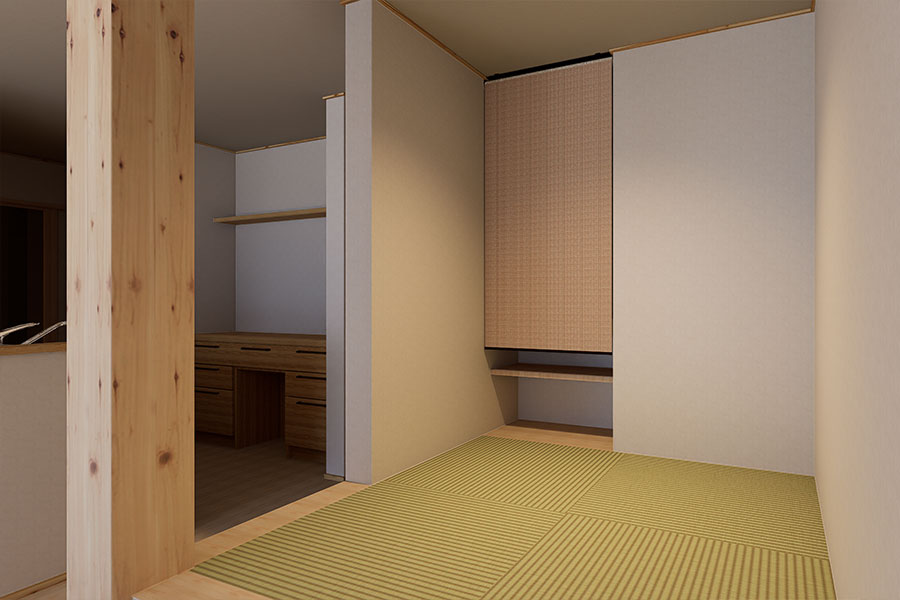 2帖分の畳コーナーは一段高く設けているため、ソファ代わりに腰掛けたり、横になってお昼寝をしたりと、多目的に活用できます。リビングと繋がりつつも、程よく気分を切り替えられる、心落ち着く和のスペース。