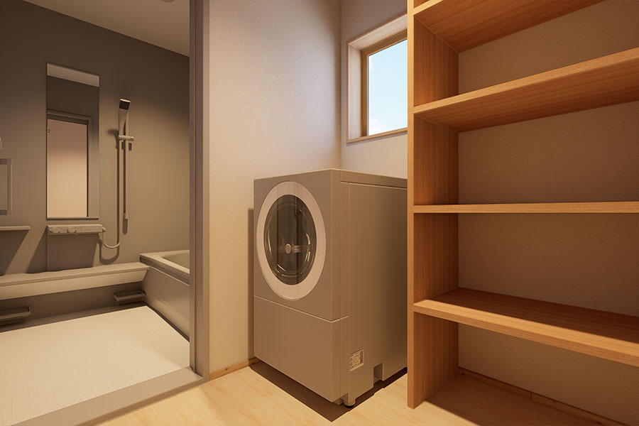 室内物干し金物を備えた脱衣室は、天候や時間を気にせず洗濯物を干すことができます。すぐ近くにクローゼットを配置しているため、「洗う・干す・しまう」の動線が短く、家事ラクな間取りを実現しています。