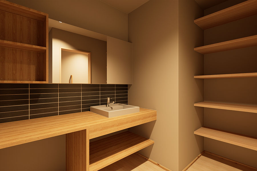 新産住拓オリジナルの造作洗面台を採用。タイル使いやカウンターの高さ・幅を計画的にデザインし、毎日の支度時間が少し楽しみになるような、機能性とデザイン性を兼ね備えた洗面スペースです。