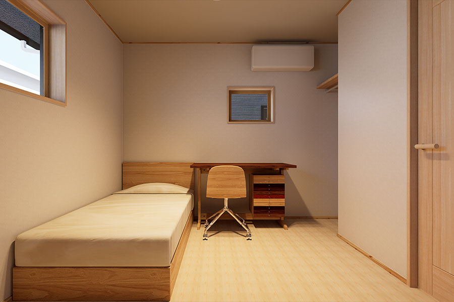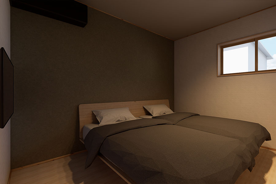 5.3帖の主寝室は、「しっかり休む」ことに重点を置いたシンプルで落ち着いた空間。壁の一面にはアクセントクロスを採用し、さりげなくデザイン性をプラスしています。