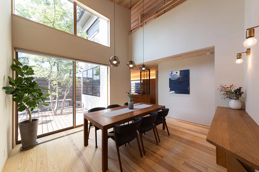 開放感たっぷりの広々ダイニング。大きな掃き出し窓と上部の窓からはどんぐりの木を眺めることができます