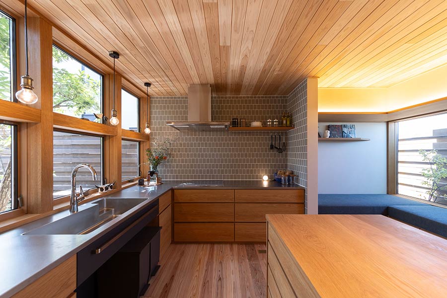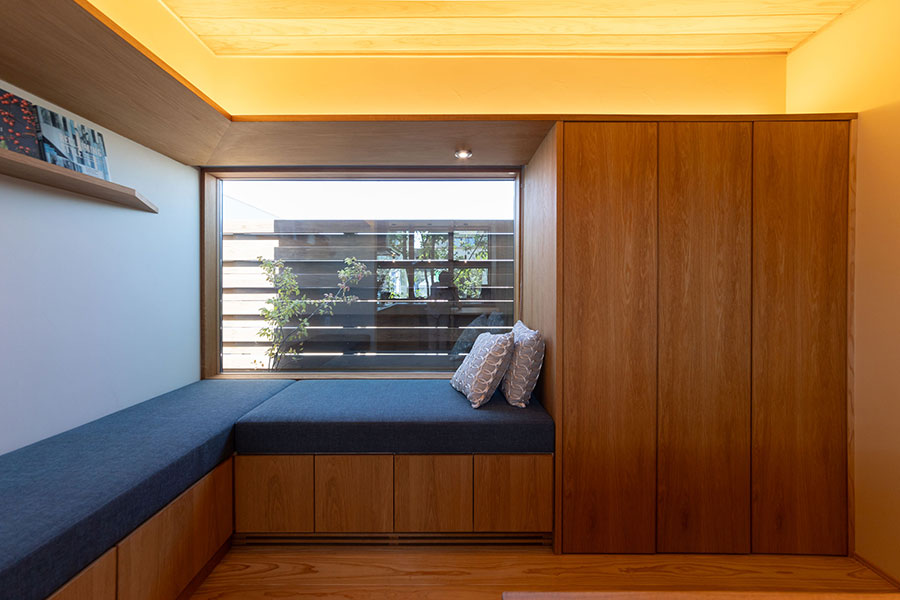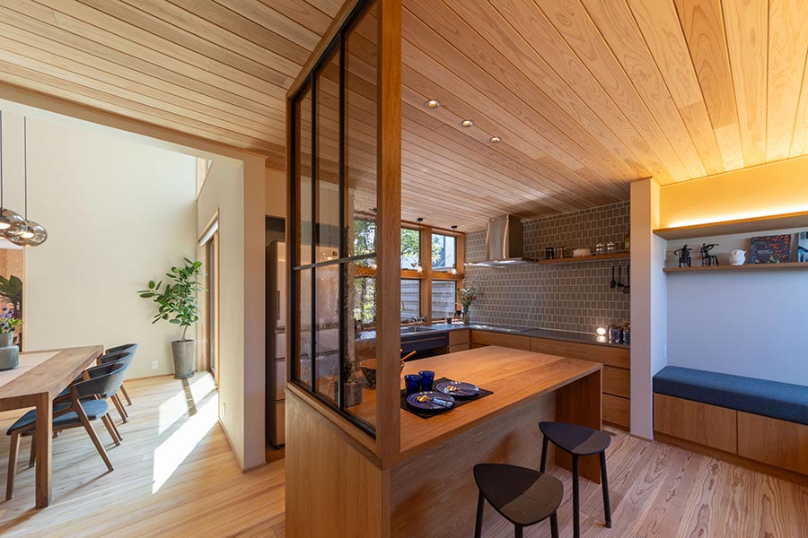 キッチン近くに設けた窓辺のヌックや階段下の書斎スペース、スキップフロアのリビングなど、家族の居場所がそこかしこに配置された住まいです。