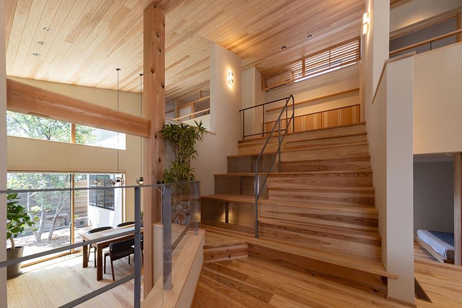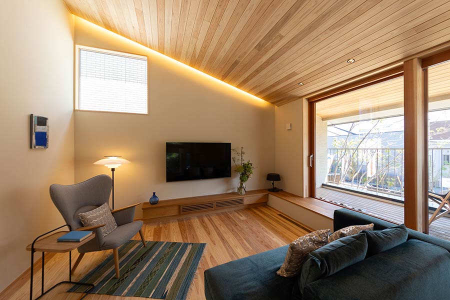 ダイニング・キッチンから少し離れたスキップフロアにあるリビング。視線を上げることでプライバシーを確保できます