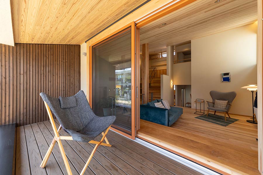 リビングから続く高さのあるウッドデッキ(スカイデッキ)では、外の景色を眺めながらホッと寛ぐ時間を過ごせます。