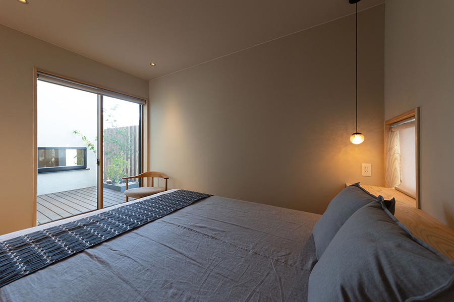 杉に囲まれた、暖かみのある主寝室。プライベートデッキや裏庭を望むことができます