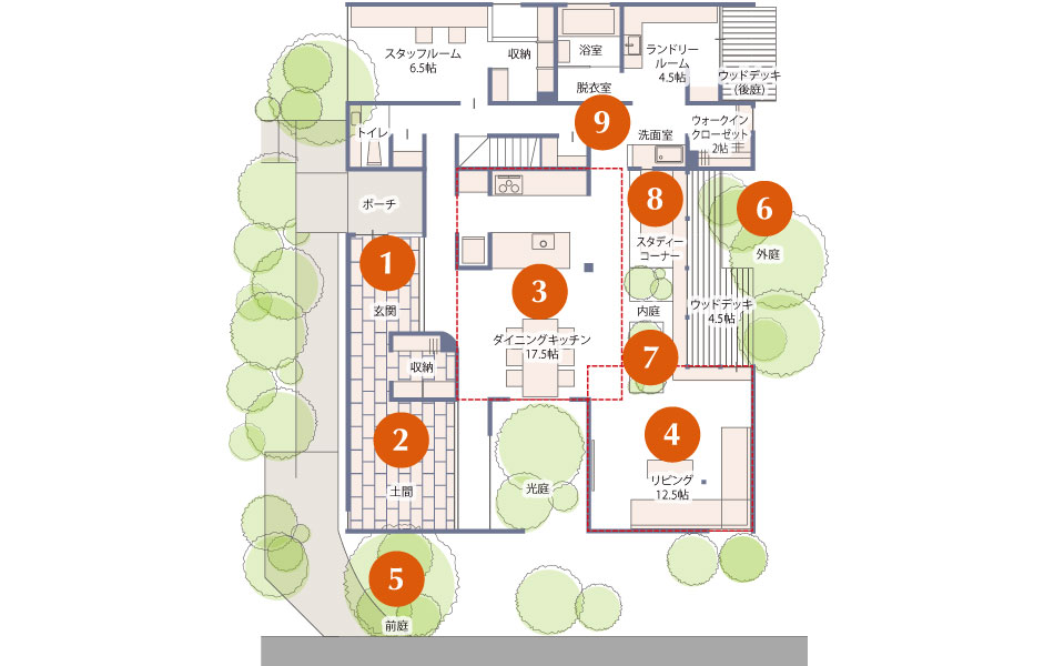 この五つの庭には、家族のプライバシーを確保しつつ、内と外とをつなげる役割があります。