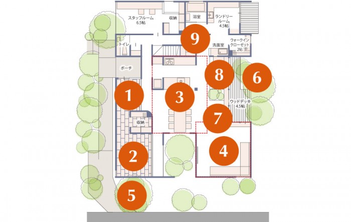 人と自然が共に暮らすこの棲家は、「緑や空」と「住まい」をつなぐ五つの庭があります。