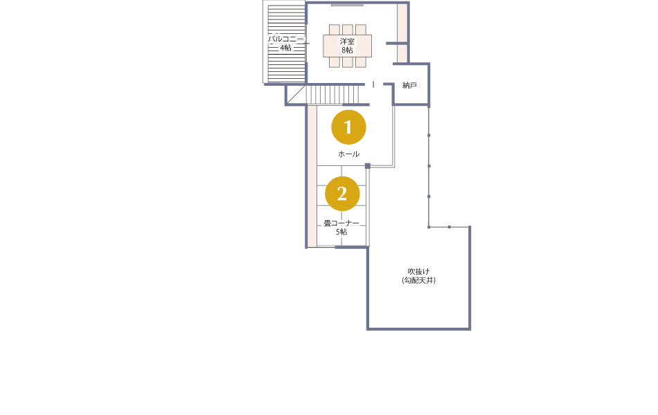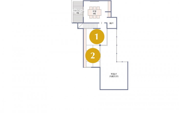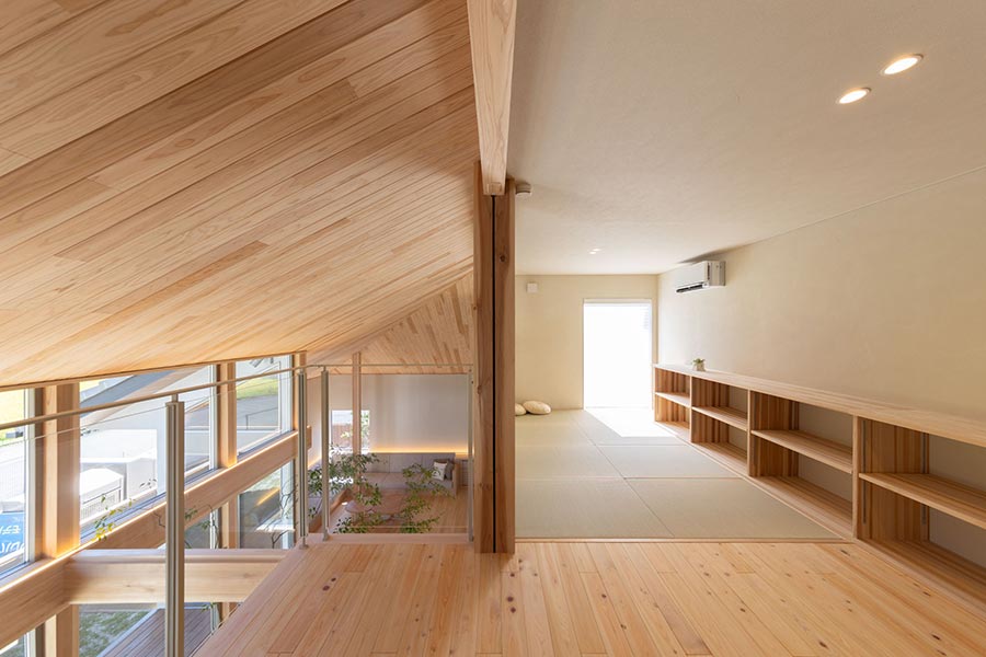 吹抜けを介して1階のリビングや内庭とつながる、開放的な空間です。