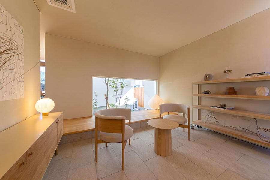 光庭のサクラの⾵景と、内庭の緑を感じられる、この住まいの中で最も⼼地よい空間です。