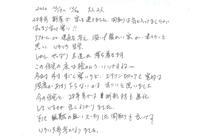 【宿泊体験にご参加いただいたM様のご感想】外はすごく寒いけのに、エアコンを切っても室内は温度があまり下がらないのはすごい!