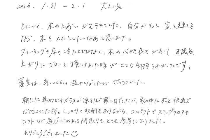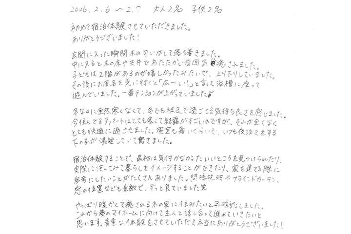 【宿泊体験にご参加いただいたK様のご感想】最初は気付かなかったいいところを見つけられたり、実際に使ってみて暮らしをイメージすることができたり、家を建てる際に参考にしたいことがたくさんありました。