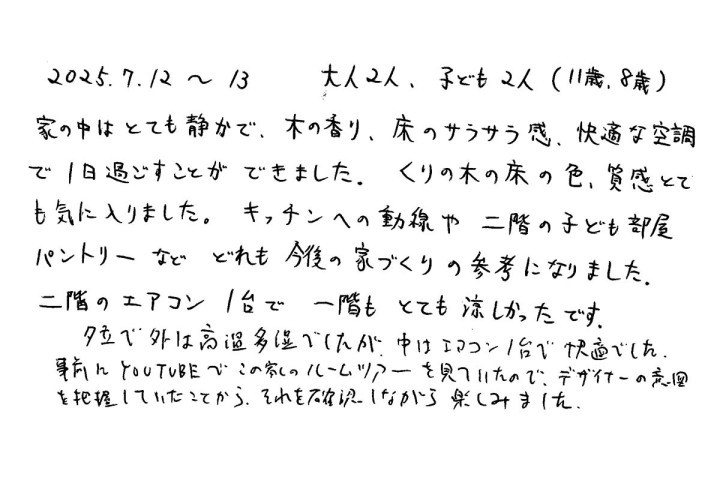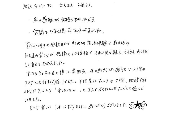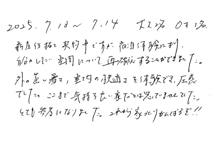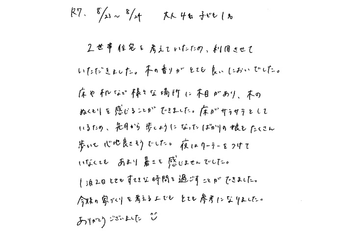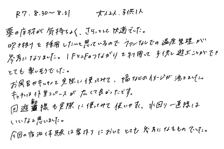 【宿泊体験にご参加いただいたN様のご感想】ここまで気持ち良い家だとは思っていませんでした。とても参考になりました。これから家づくりがんばるぞ!!