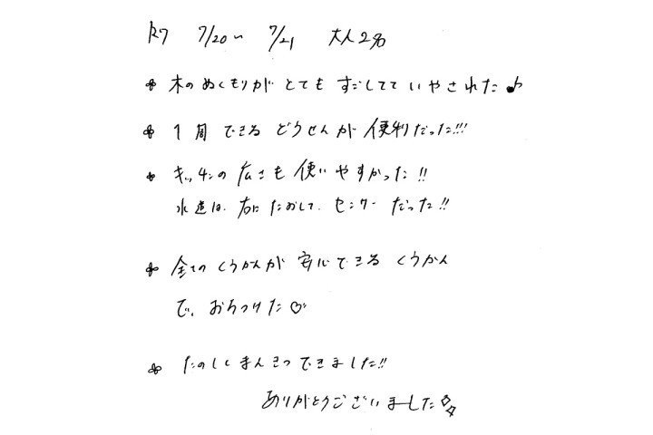 【宿泊体験にご参加いただいたH様のご感想】夜はクーラーをつけていなくても、あまり暑さを感じませんでした。1泊2日、とても素敵な時間を過ごすことができました。