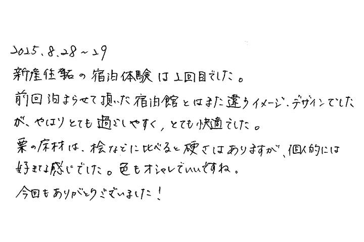 【宿泊体験にご参加いただいたO様のご感想】前回、泊まらせていただいた宿泊館とは、また違うイメージ・デザインでしたが、やはりとても過ごしやすく、快適でした。