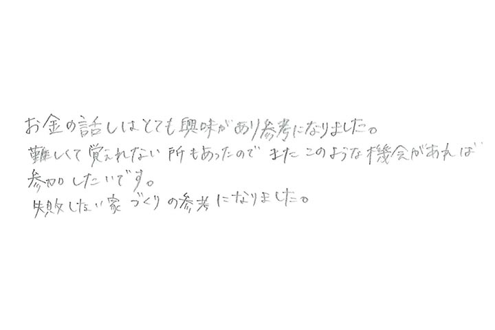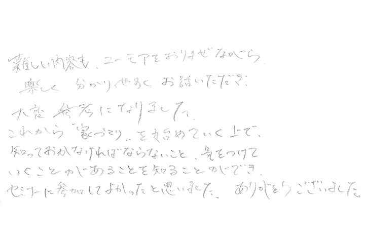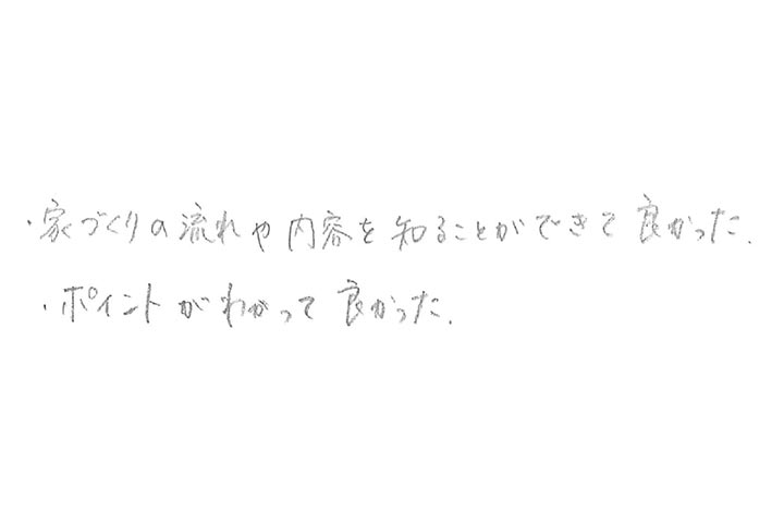 家づくりの流れや内容を知ることができて良かった。ポイントがわかって良かった。