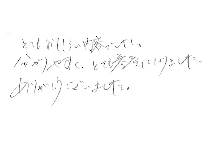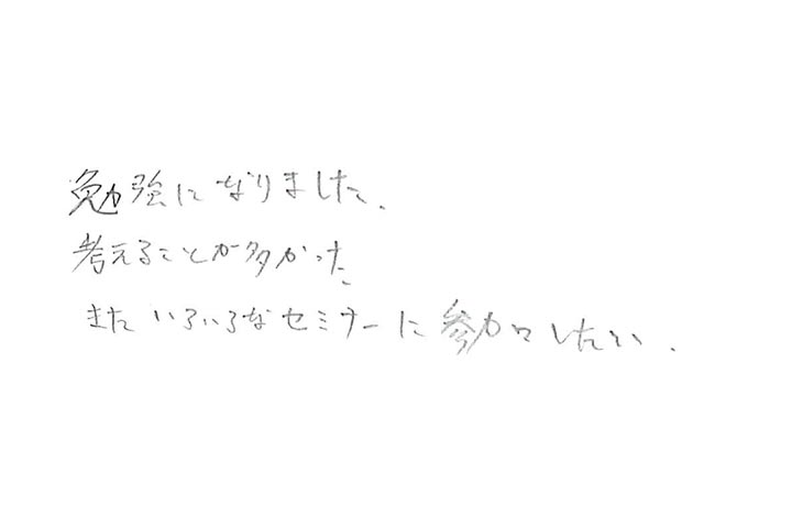 難しい内容も、ユーモアを織り交ぜながら、楽しく、わかりやすくお話しいただき大変参考になりました。