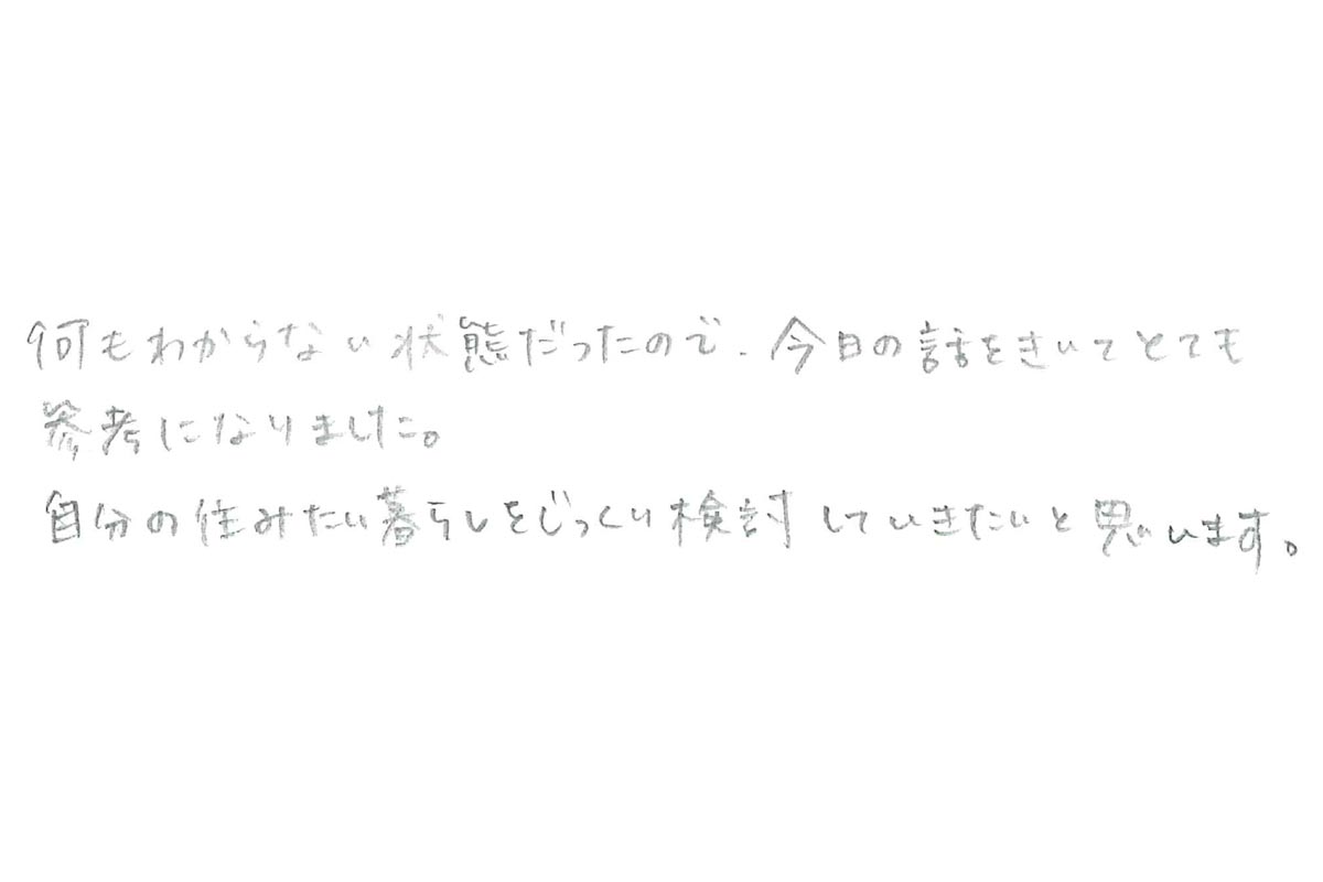 何もわからに状態だったので、今日の話を聞いて、とても参考になりました。 自分の住みたい暮らしをじっくり検討していきたいと思います。