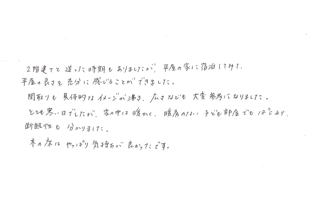 【宿泊体験にご参加いただいたM様のご感想】平屋の良さを充分に感じることができました。