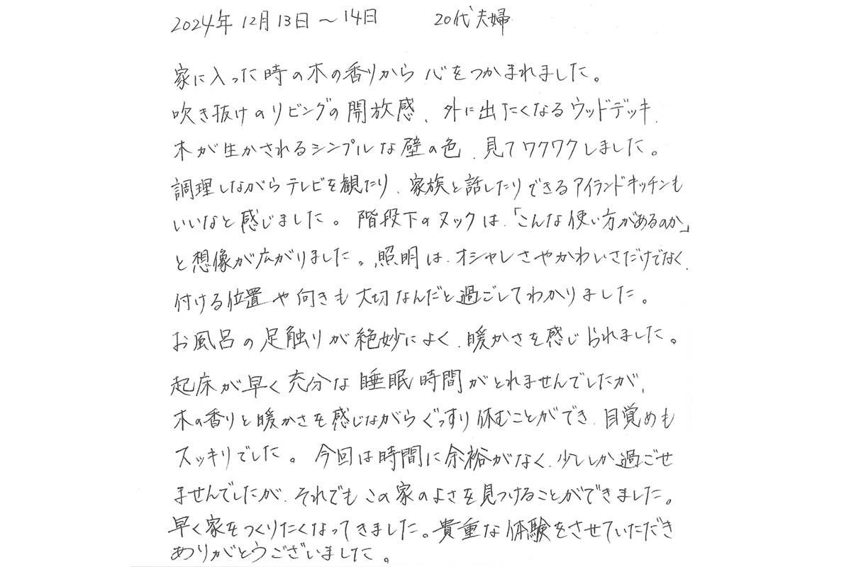 【宿泊体験にご参加いただいたG様のご感想】木の香りと暖かさを感じながらぐっすり休むことができ、目覚めもスッキリでした。