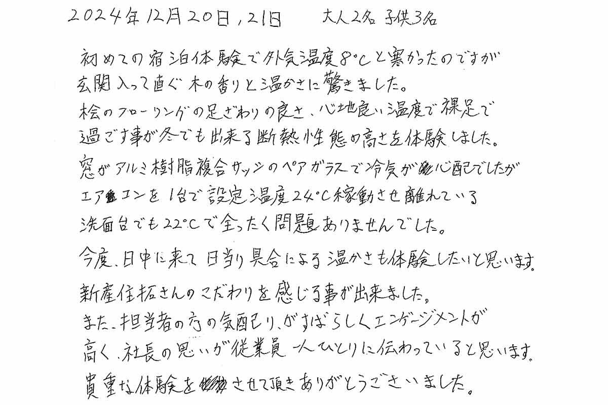 【宿泊体験にご参加いただいたK様のご感想】外気温度は8度と寒かったのですが、玄関に入ってすぐ木の香りと暖かさに驚きました。