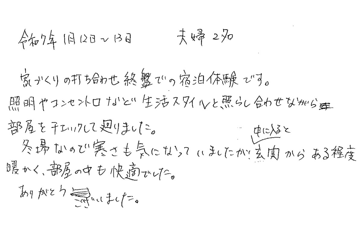 【宿泊体験にご参加いただいたE様のご感想】冬場なので寒さも気になっていましたが、中に入ると玄関からある程度暖かく、部屋の中も快適でした。