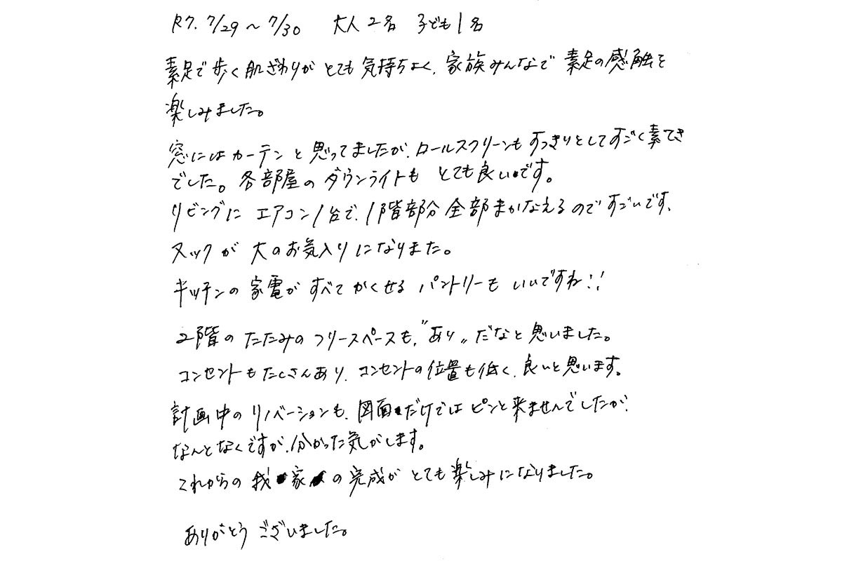 【宿泊体験にご参加いただいたI様のご感想】素足で歩く肌ざわりがとても気持ちよく、家族みんなで素足の感触を楽しみました。