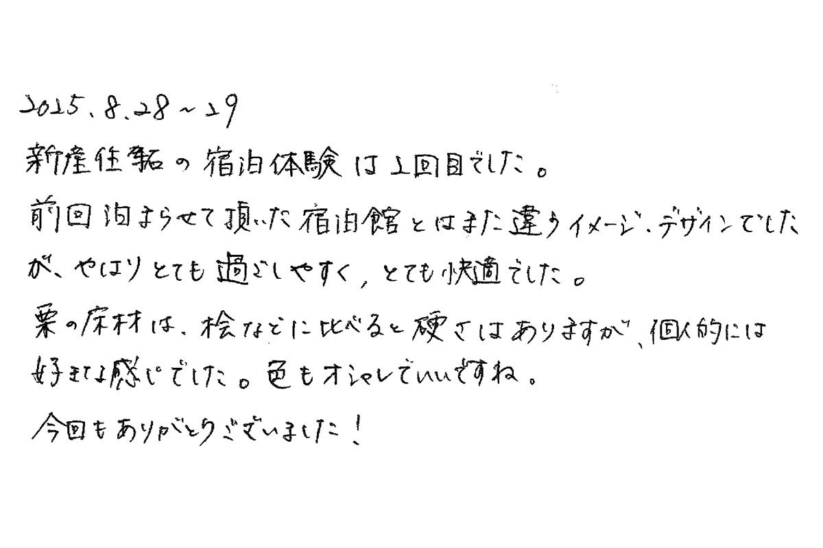 【宿泊体験にご参加いただいたO様のご感想】前回、泊まらせていただいた宿泊館とは、また違うイメージ・デザインでしたが、やはりとても過ごしやすく、快適でした。
