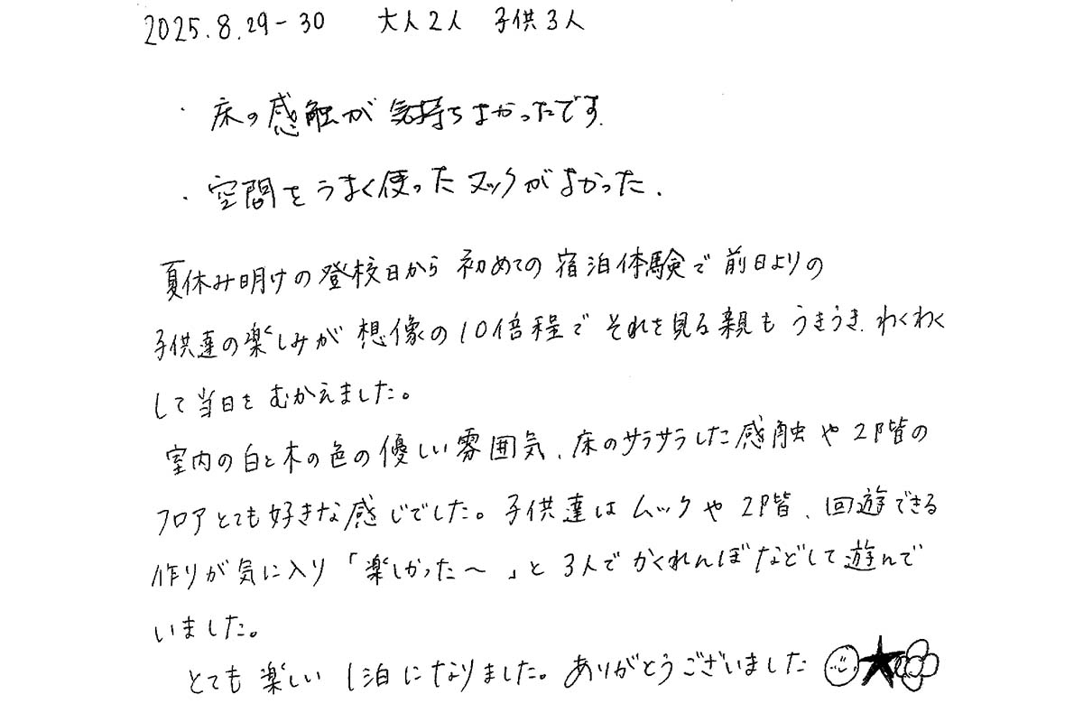 【宿泊体験にご参加いただいたK様のご感想】室内の白と木の色の優しい雰囲気、床のサラサラした感触や、2Fのフロアがとても好きな感じでした。