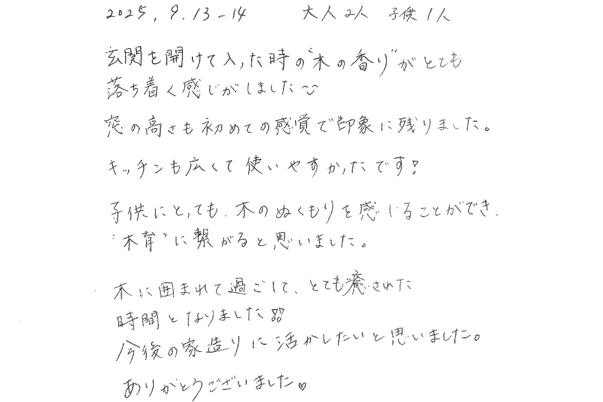 【宿泊体験にご参加いただいたN様のご感想】子どもにとっても、木のぬくもりを感じることができることは、“木育”に繋がると思いました。