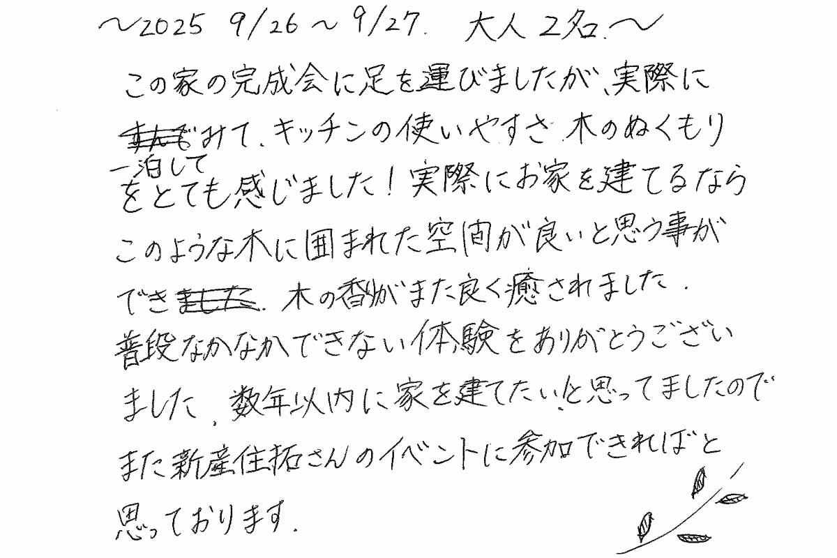 【宿泊体験にご参加いただいたO様のご感想】実際に1泊してみて、キッチンの使いやすさ、木のぬくもりをとても感じました!