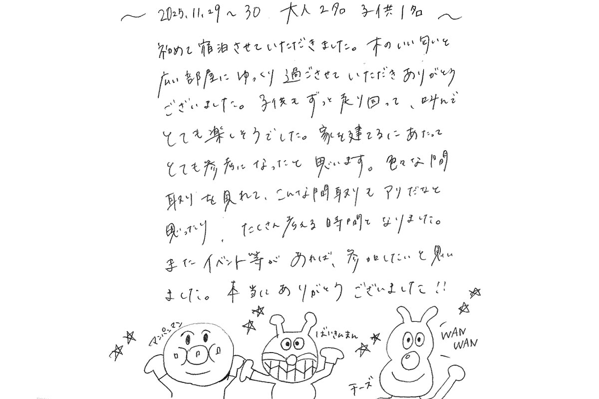 【宿泊体験にご参加いただいたA様のご感想】いろいろな間取りを見れて、こんな間取りもアリだなと思ったり、たくさん考える時間となりました。