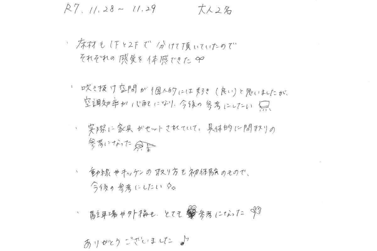 【宿泊体験にご参加いただいたH様のご感想】実際に家具がセットされているので、具体的な間取りの参考になりました。