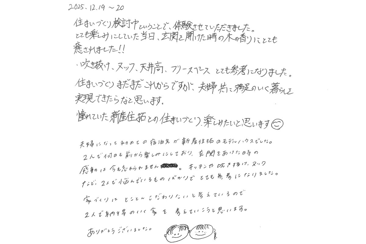 【宿泊体験にご参加いただいたT様のご感想】憧れていた新産住拓との住まいづくり、楽しみたいと思います(*^-^*)