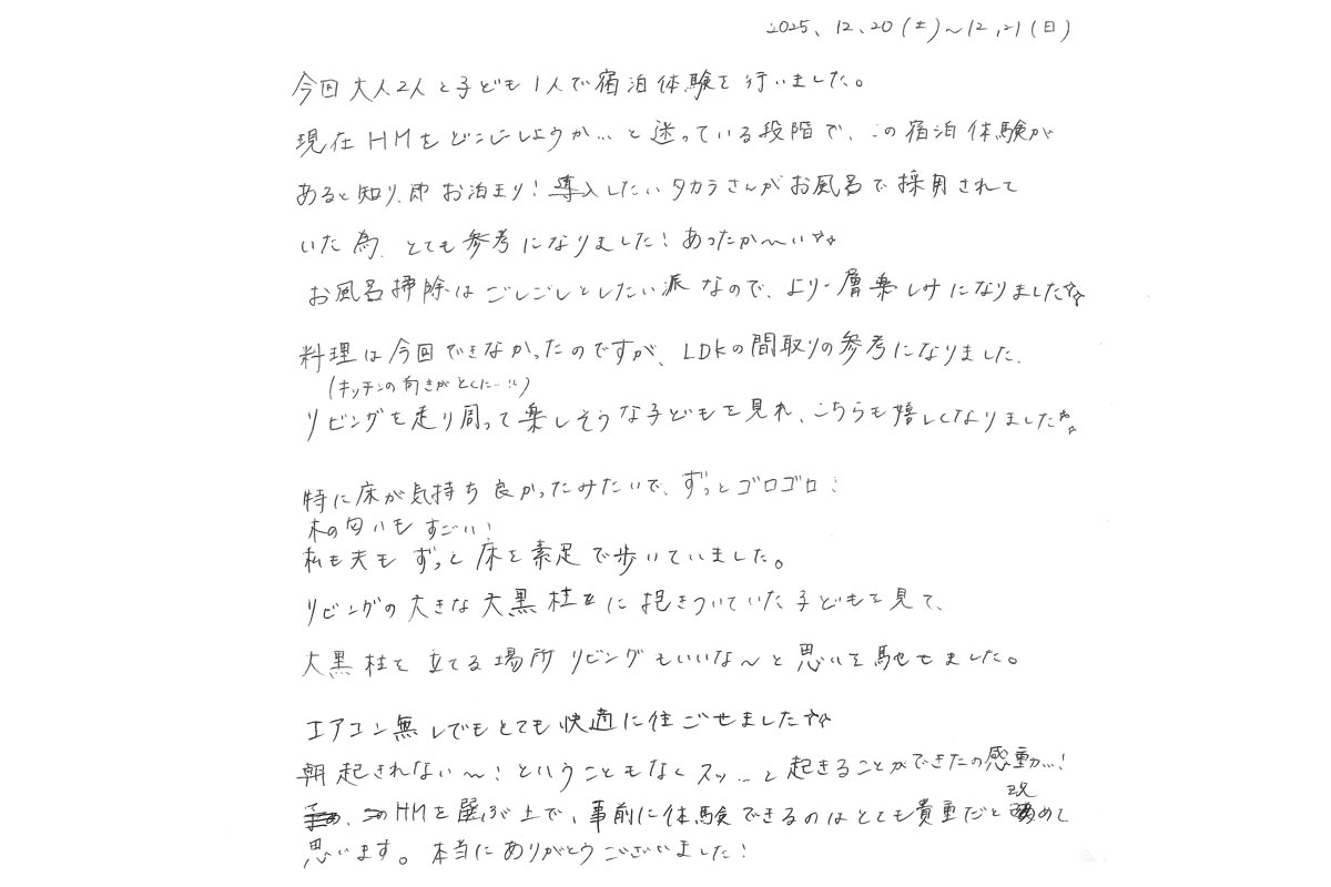 現在、ホームメーカーをどこにしようか…と迷っている段階で、この宿泊体験があると知り、即お泊まり!