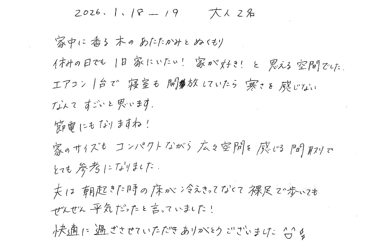 【宿泊体験にご参加いただいたY様のご感想】朝起きた時の床が冷え切ってなくて、裸足で歩いても全然平気でした!
