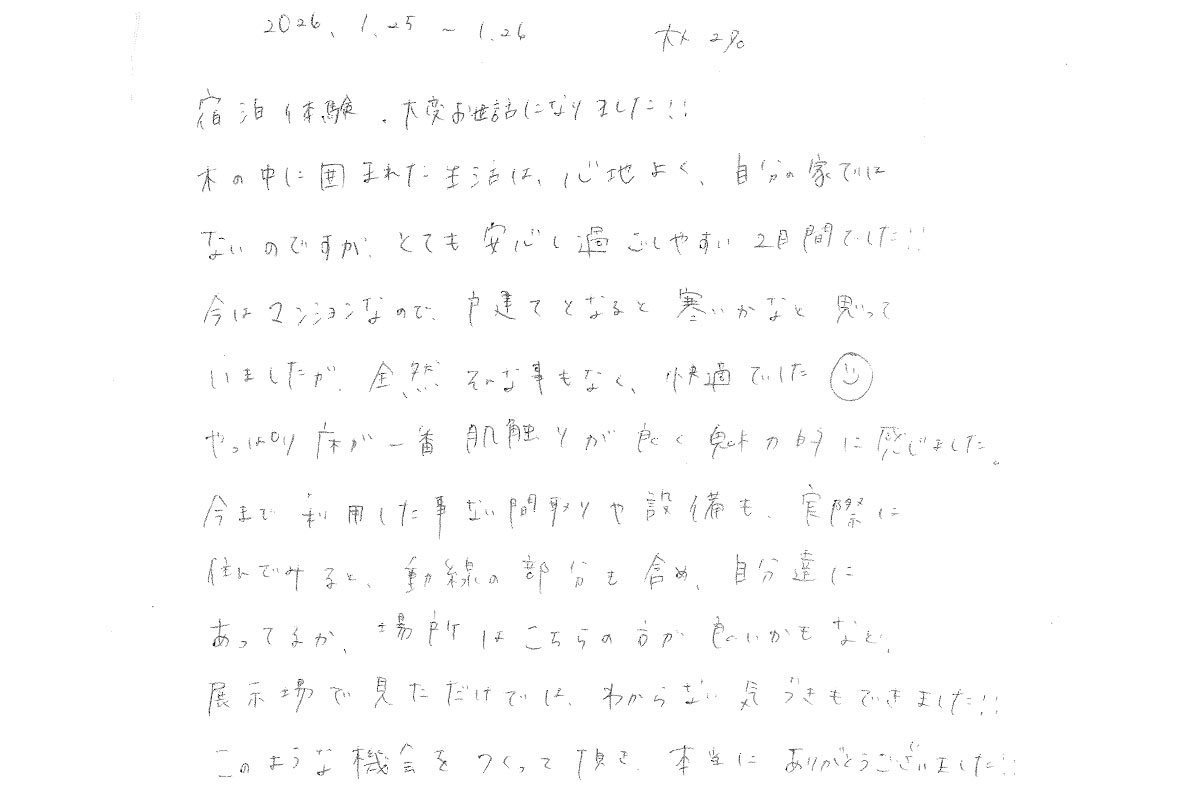 【宿泊体験にご参加いただいたY様のご感想】今まで利用したことのない間取りや設備も、実際に住んでみると動線の部分も含め、展示場で見ただけではわからない気づきもありました!