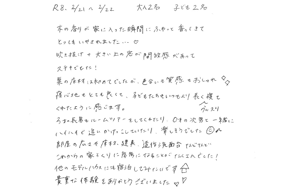 【宿泊体験にご参加いただいたY様のご感想】部屋の広さや床材、建具、造作洗面台などなど、これからの家づくりに参考になることがたくさんでした!