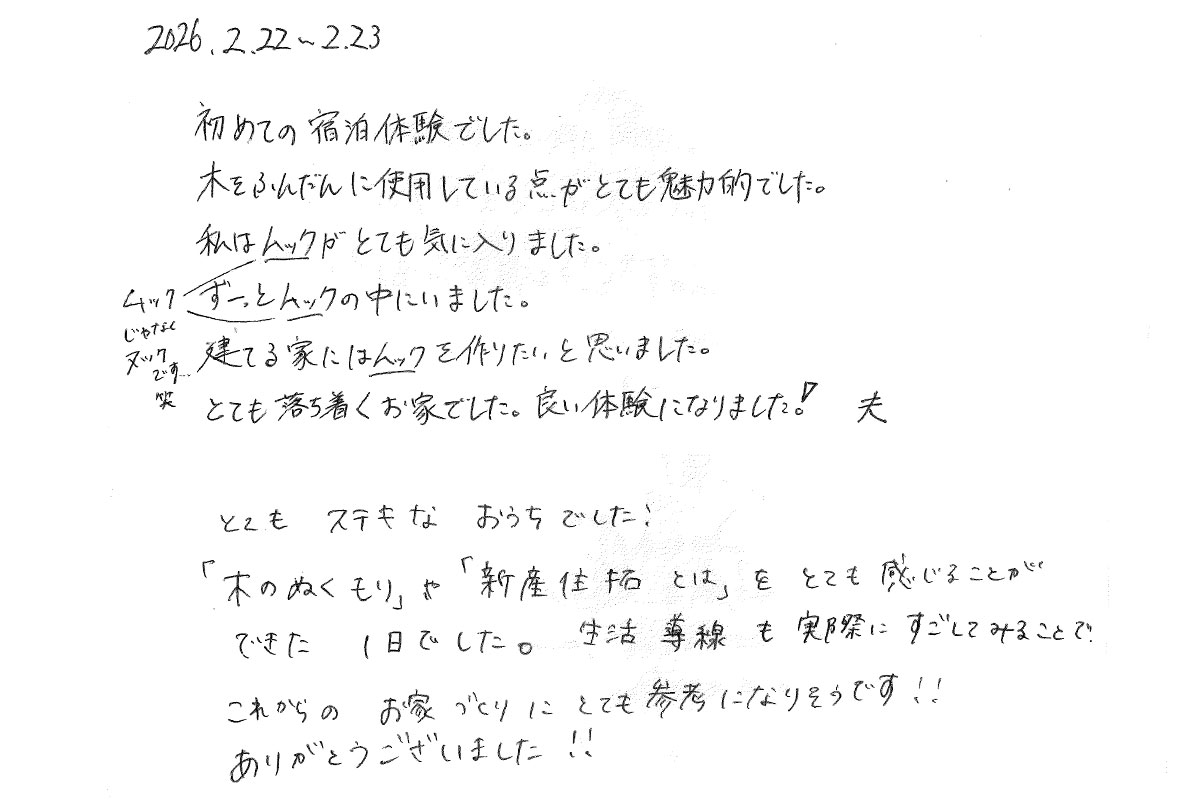 【宿泊体験にご参加いただいたY様のご感想】実際に過ごしてみることで、生活動線など、これからのお家づくりにとても参考になりそうです!!