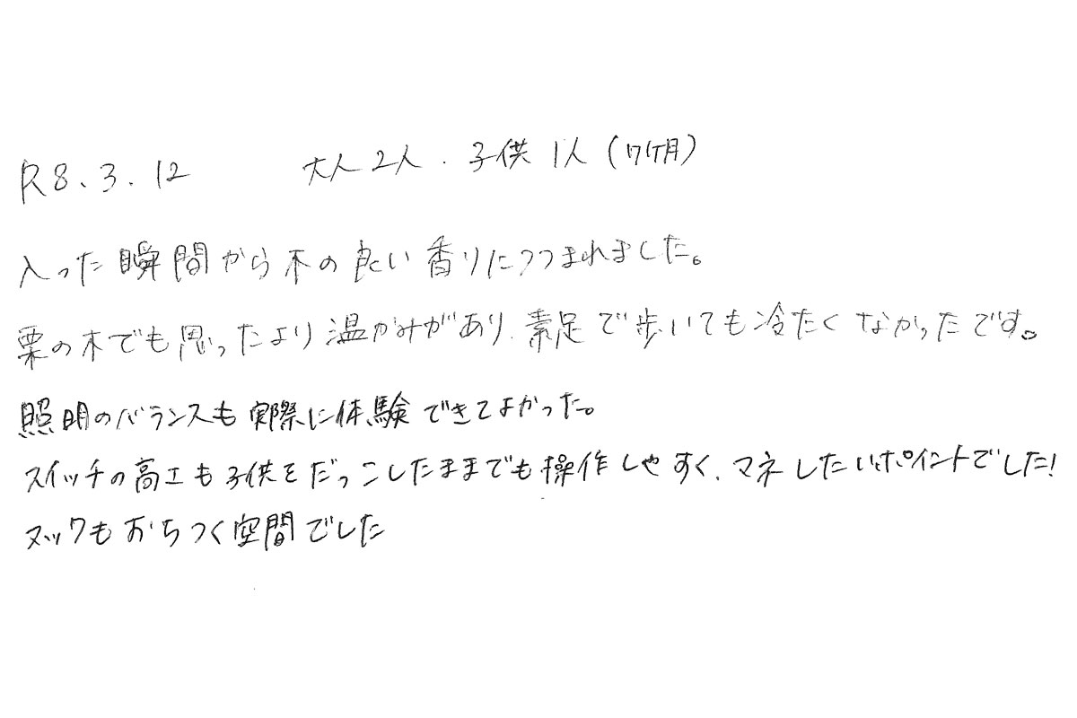 【宿泊体験にご参加いただいたM様のご感想】入った暖間から、木の良い香りに包まれました。