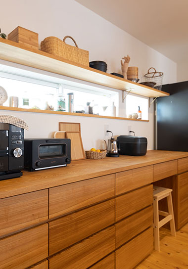 収納力もあり、お家時間の多くをキッチンで過ごす奥様の読書や勉強のスペースとしても、お使いいただいているとのことです。 -